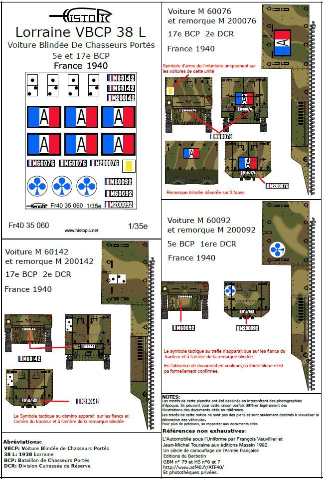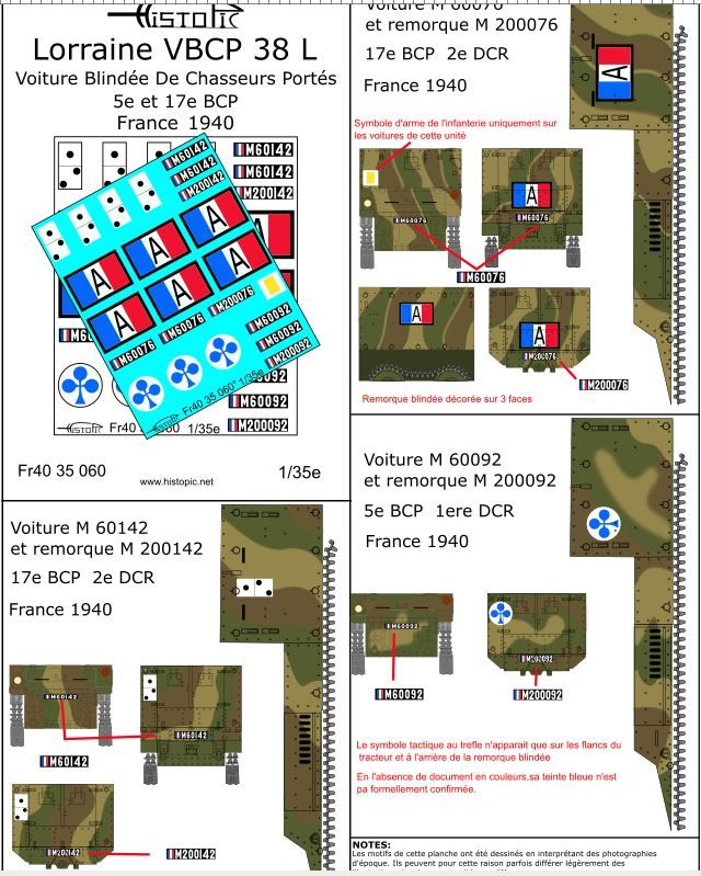 Décalques pour 3 Voitures Blindées de Chasseurs portés VBCP 38 L Lorraine, Franc 1940