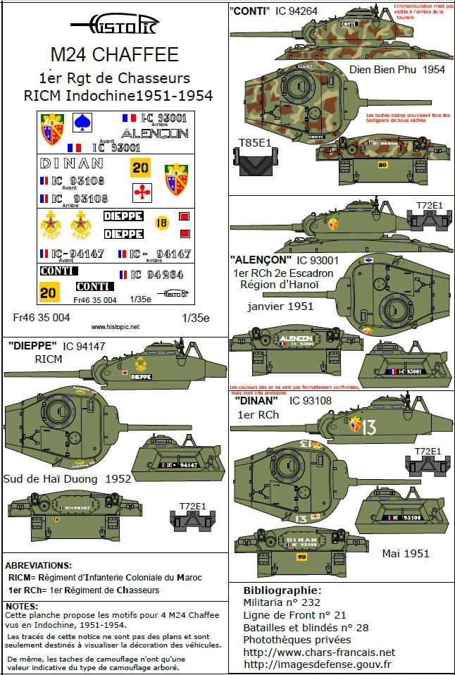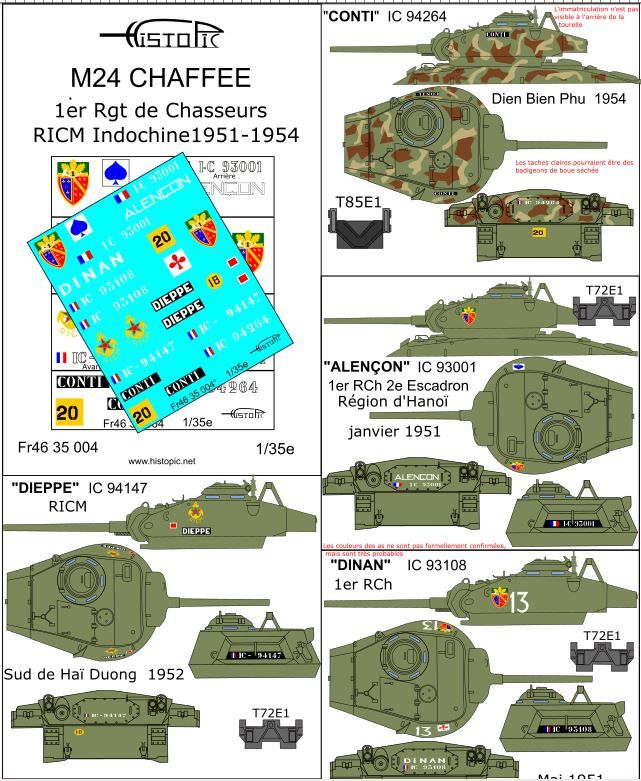Décalques pour 4 M 24 Chaffee français en Indochine, 1951, 1954. Le "Conti" à Dien Bien Phu, 2 M24 du 1er Régiment de chasseurs, et 1 M 24 du RICM.