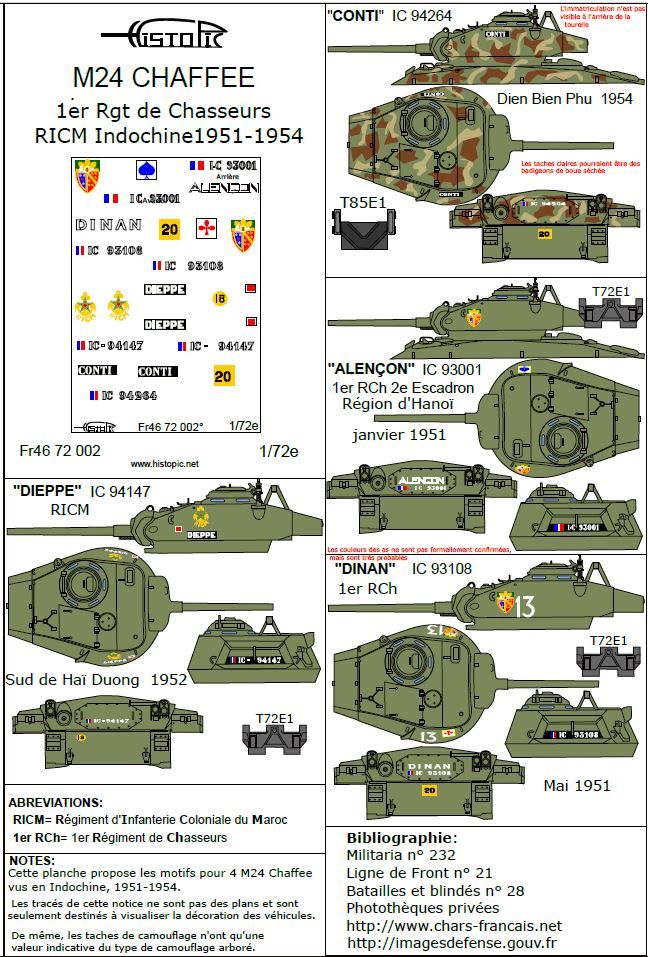 Décalques pour 4 M 24 Chaffee français en Indochine, 1951, 1954. Le "Conti" à Dien Bien Phu, 2 M24 du 1er Régiment de chasseurs, et 1 M 24 du RICM.