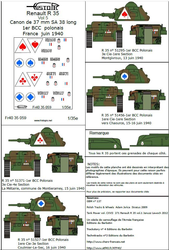 Décalques pour 4 chars légers R 35 à canon long SA 38 du 1er BCC Polonais en France 1940